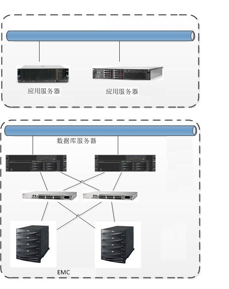 位于雅宝路机房,主要有一套数据库和多套应用,数据库部署在2台未做逻辑分区的小型机上,应用部署在服务器。数据库是oracle 11.2.0.3,搭建了RAC环境,通过冗余的SAN网络把数据部署在两台EMC存储;应用服务器大约6台,应用数据放置在刀片内置磁盘。