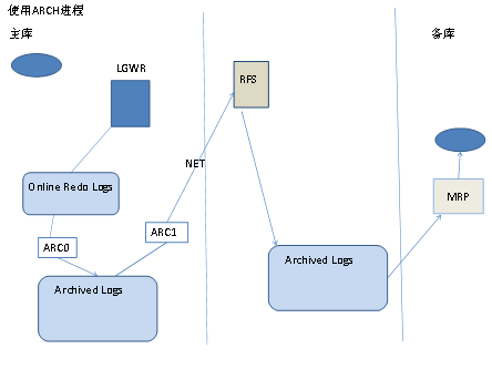 这种方式主库只有在发生归档时才会发送日志到备库,首先生产端主库有业务变更时候,发生日志切换时候,在本地归档同时,将归档日志通过网络传输到备端,备端通过mrp进程进行块级别的复制还原主库,达到数据库复制的目的,但是如果生产主库异常宕机,联机日志中的Redo内容没有来得及传输到备端,即会产生数据库丢失;
