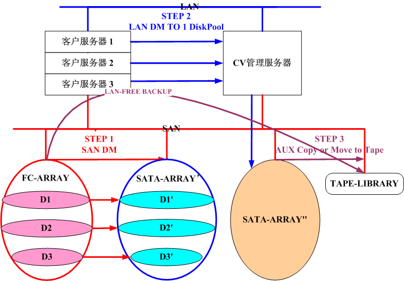 2) NetApp-ARRAY作为LAN迁移的2级存储,采用1个LUN,由CV管理服务器统一管理,作为主存储的统一池。如果CommServe接入在SAN中,该存储可以和NetApp-ARRAY为同一台存储。