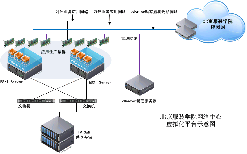 北京服装学院网络中心经过一个多月的虚拟化测试,更好的了解了VMware的虚拟架构,体验了VMware服务器虚拟架构软件实现x86平台服务器的虚拟化整合、高可用性及业务连续性等完善可行的解决方案。对x86服务器虚拟化整合过程中所涉及到的相关技术进行验证,以检验VMware虚拟架构解决方案的可行性、可靠性及稳定性。