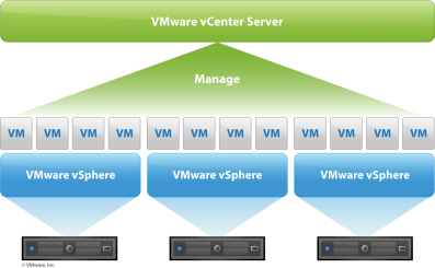 综上所述,vCenter Server提供了管理任意规模的虚拟IT环境所需的最高级别的简便性、效率、安全性和可靠性。如下图所示: