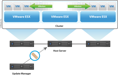 利用 Update Manager 和 DRS 无中断地升级 Hypervisor。大批量地升级 Hypervisor并且不影响任何应用的运行,虽然 Hypervisor会重启,但确保虚拟机永不停机。