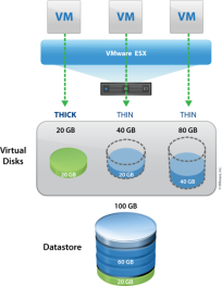 vStorage Thin Provisioning可让用户分配比实际购买的容量更多的存储容量,从而获得更高的存储利用率。过去,应用程序管理员在评估和设定容量需求时,需要将未来不断增长的容量需求考虑在内。这样过量部署容量常常导致空间闲置,这与在服务器空间中过量部署 RAM 的问题类似。Thin Provisioning 使管理员只需管理可用存储空间的利用率。有了 Thin Provisioning,虚拟机可访问比实际占用空间更多的存储空间。