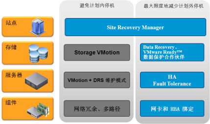 本方案针对网络中心虚拟化环境的构建,充分考虑提高所有VMware虚拟化环境的可用性设计,利用SAN网络和磁盘阵列构建共享存储及VMware高可用集群环境;在网络层面和存储层面分别利用了VMware vSphere内置的网络冗余和存储多路径控制确保高可用;在服务器高可用性上,方案推荐的企业增强版内置了VMware DRS HA和vMotion等功能可以应对本地站点多种虚拟机应用计划内和计划外意外停机的问题。