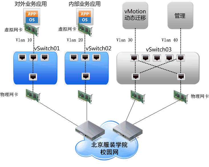 本方案中虚拟化平台网络包含业务应用网络,管理网络和VMotion心跳网络。其中业务应用网络包含对外业务应用和内部业务应用。根据最佳实践,网络架构设计如下: