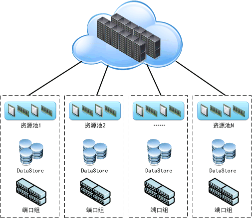 如图所示,资源池内部是计算资源和内存资源、Datastore提供存储资源、端口组提供网络资源,本方案中涉及的2台服务器集群是一个大资源池,从中可以分配不同的资源池以对应不同行业用户群,通过设定资源池的预留、限制和共享值来实现资源池的资源划分、资源隔离以及资源的过载,提高整个系统的利用率。