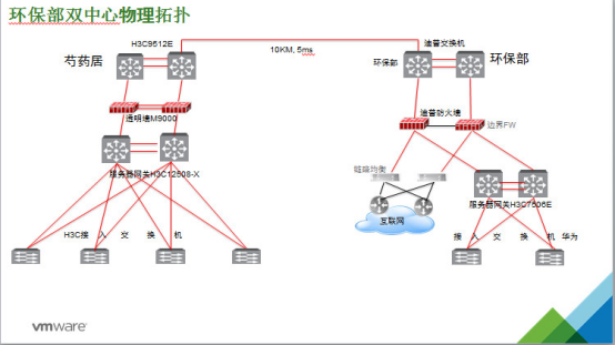 环保部网络由两个数据中心组成,分别是芍药居数据中心和环保部数据中心,两个数据中心应用专线连接。网络平台采用主流的万兆网络平台、基础业务平台系统采用虚拟化VMware5.1承载各类业务,提供大概200多个虚拟机在为业务服务。环保部拓扑图