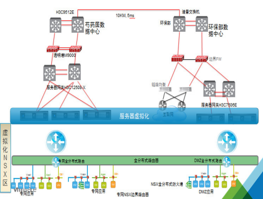 整个虚拟化环境设置两个集群,NSX组件包含虚拟防火墙、虚拟路由器及VXlan,他们分别在两个数据中心部署,虚拟机通过VXlan传输,保障两个数据中心之间相互迁移不掉网。