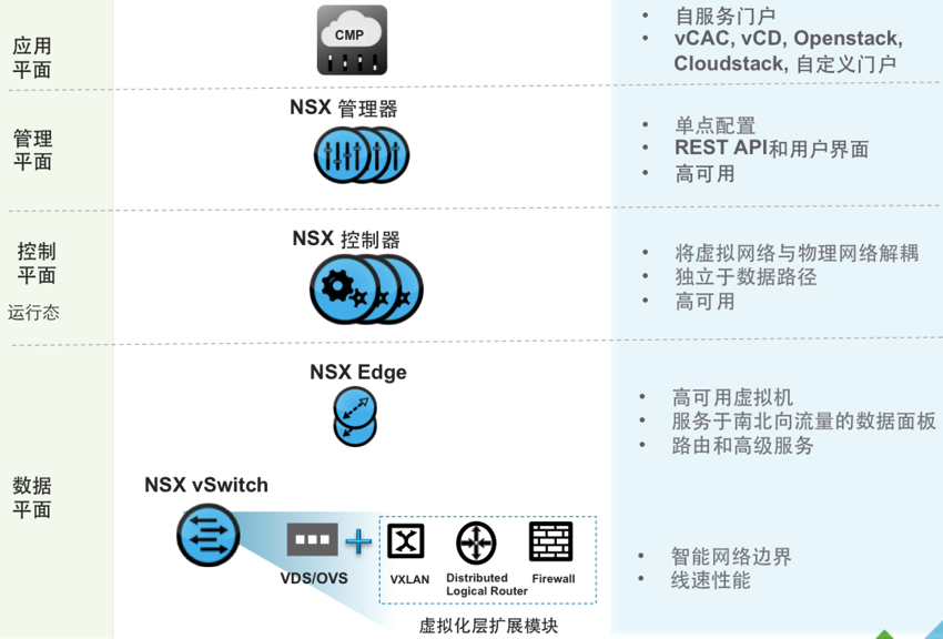 NSX聚集了四个基本模块:数据转发平面、控制平面、管理平面和应用平面,如下图所示。