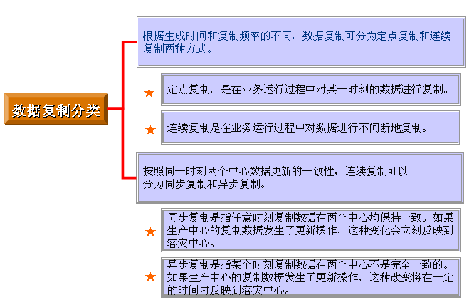 不同企业的不同业务需求和应用特点将可能需要有不同的容灾技术要求,可以采用多种容灾技术来建容灾系统,专业咨询服务部将更许客户的实际需求提供不同的技术方案。对所有客户的容灾技术平台建设而言,容灾方案的技术核心是数据的保护,实现远程数据复制,并能够在灾难发生时在远端利用复制数据提供企业业务运营支撑服务,因此数据复制技术是构建容灾技术平台的核心。不同数据复制技术的分类如下:
