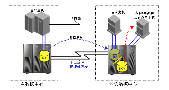 如上图所示,生产中心的“源数据—R1”通过存储本身的数据复制机制被复制到了灾备中心,即“目标数据R2”。 “目标数据R2”在正常生产情况下是不可访问的,灾备中心的后备主机只能在灾难发生时,主中心服务停止后,才可以访问“目标数据”,接管主中心的服务(基于主机和应用的容灾方案的灾备中心数据与此类似)。但采用基于存储的容灾方案时,我们可以为“目标数据”建立一个BCV卷或快照、克隆,从而可以给到另外的服务器使用。