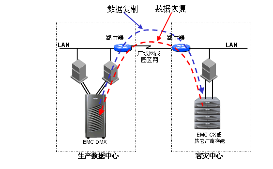 采用基于存储的容灾方案的技术核心是利用存储阵列自身的盘阵对盘阵的数据块复制技术实现对生产数据的远程拷贝,从而实现生产数据的灾难保护。在主数据中心发生灾难时,可以利用灾备中心的数据在灾备中心建立运营支撑环境,为业务继续运营提供IT支持。同时,也可以利用灾备中心的数据恢复主数据中心的业务系统,从而能够让企业的业务运营快速回复到灾难发生前的正常运营状态。