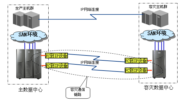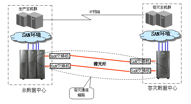 容灾系统是为核心业务系统服务,两个存储系统分别用于生产中心与灾备中心进行实时数据同步镜像,要求复制数据必须保证时间次序和一致性,并且数据不丢失,即平时RPO大约等于0,业务繁忙时候RPO小于1分钟。生产中心和容灾中心各有业务主机与存储阵列相连。