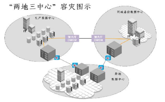 这样一个同城灾备加上异地灾备的三中心灾备方案,根据容灾规划,生产数据中心作为生产中心,运行绝大部分业务系统,并且作为集中的监控中心。同城备份中心实现与生产中心应用级的灾备功能,确保RTO和RPO范围内的业务持续运行,防御非区域性灾难。异地数据容灾中心实现数据级的备份,常规情况下用于测试系统,用于防御重大区域性灾难。